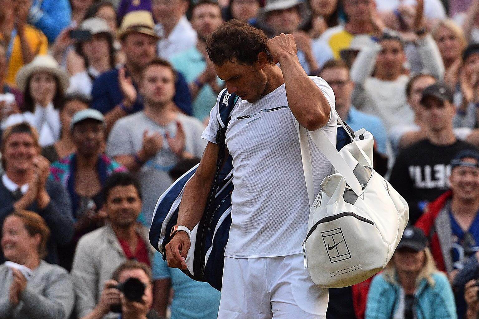 Rafael Nadal reacts after losing against Gilles Muller at The All England Lawn Tennis Club in Wimbledon on July 10, 2017.