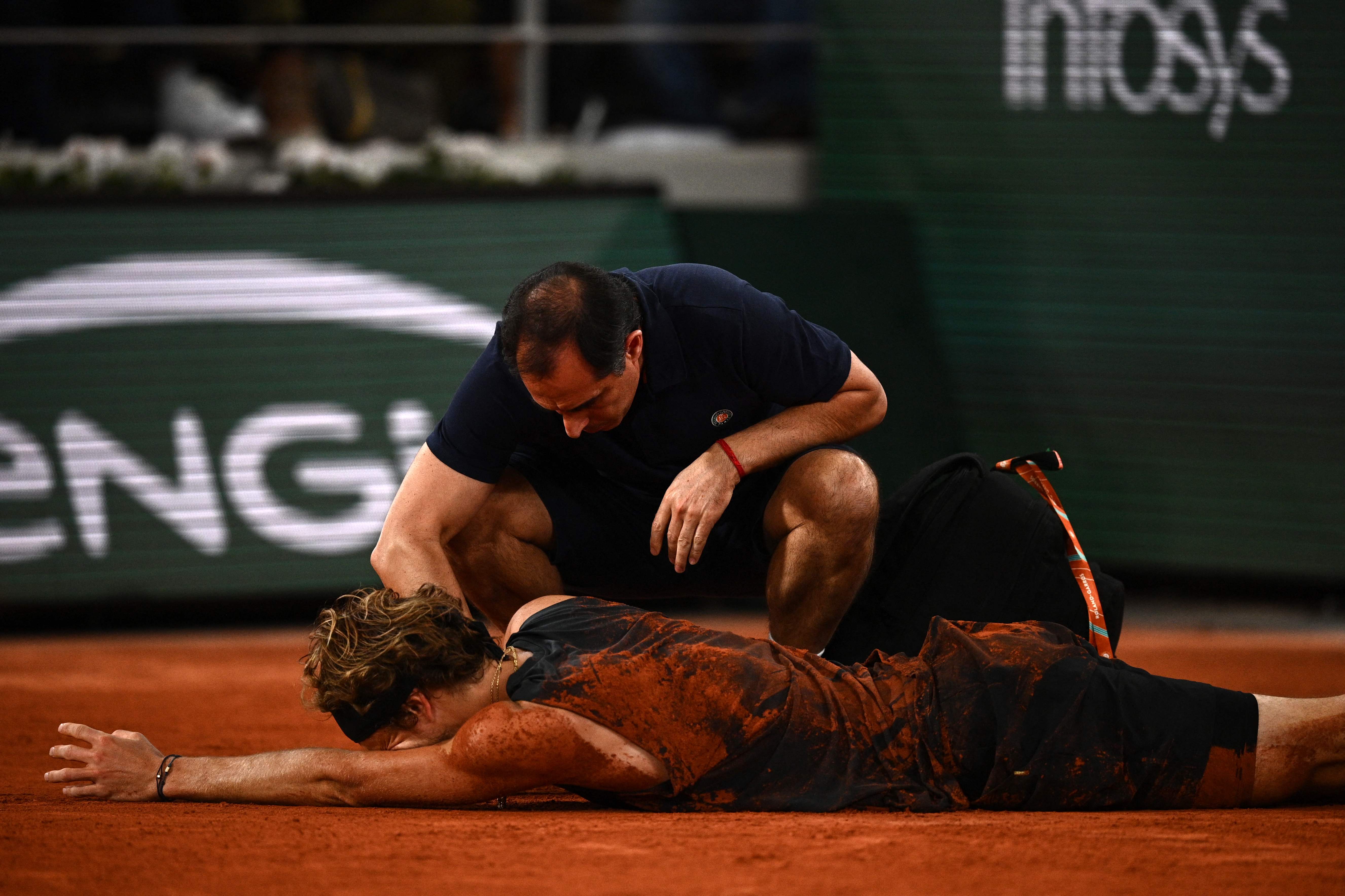 Zverev had to leave the court in a wheelchair after turning his ankle as he chased down the ball in front of the players’ boxes on Court Philippe Chatrier where his team and family were sitting.