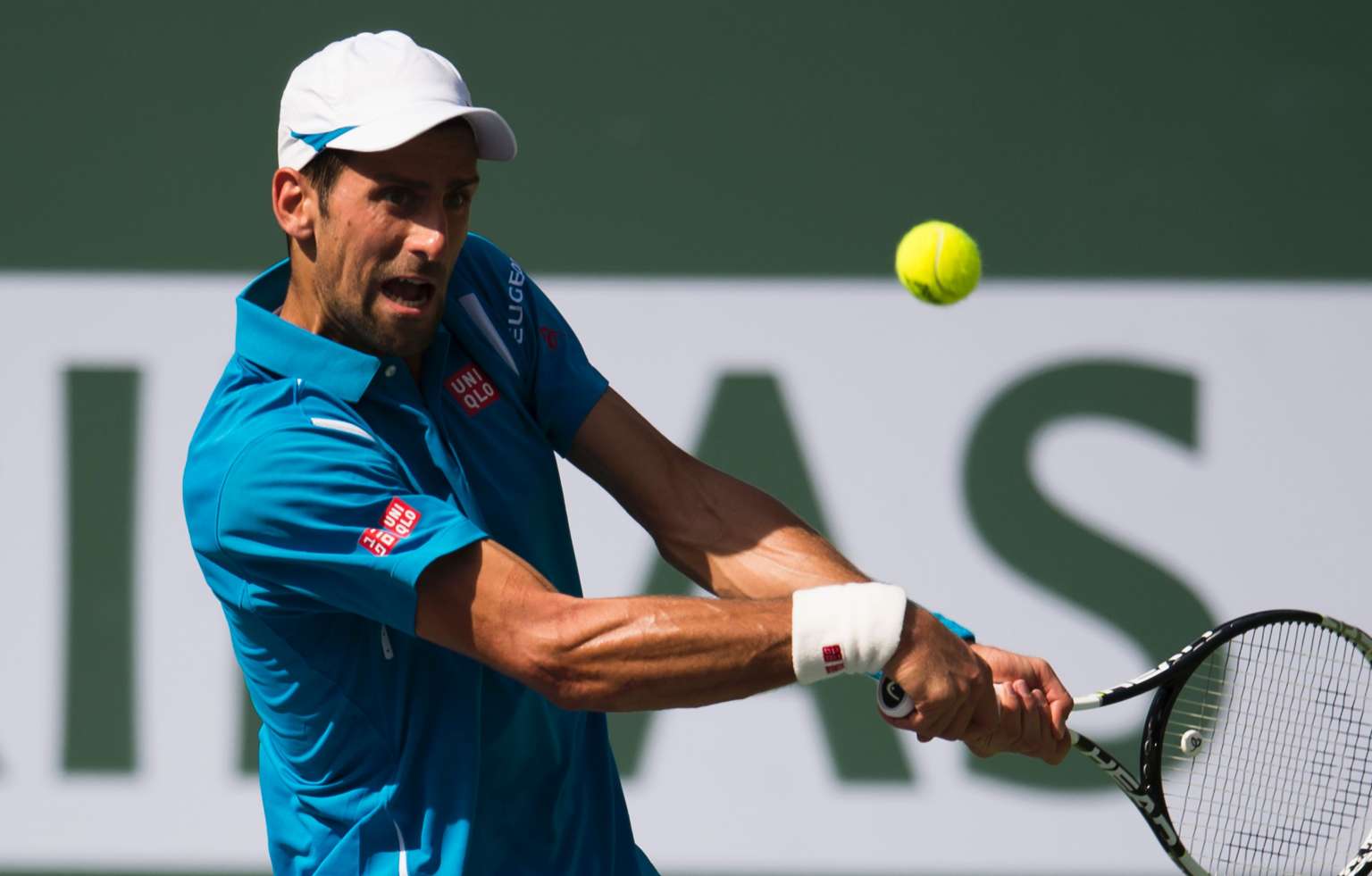 Novak Djokovic of Serbia returns the ball to Rafael Nadal in the men's semifinals, on March 19, 2016