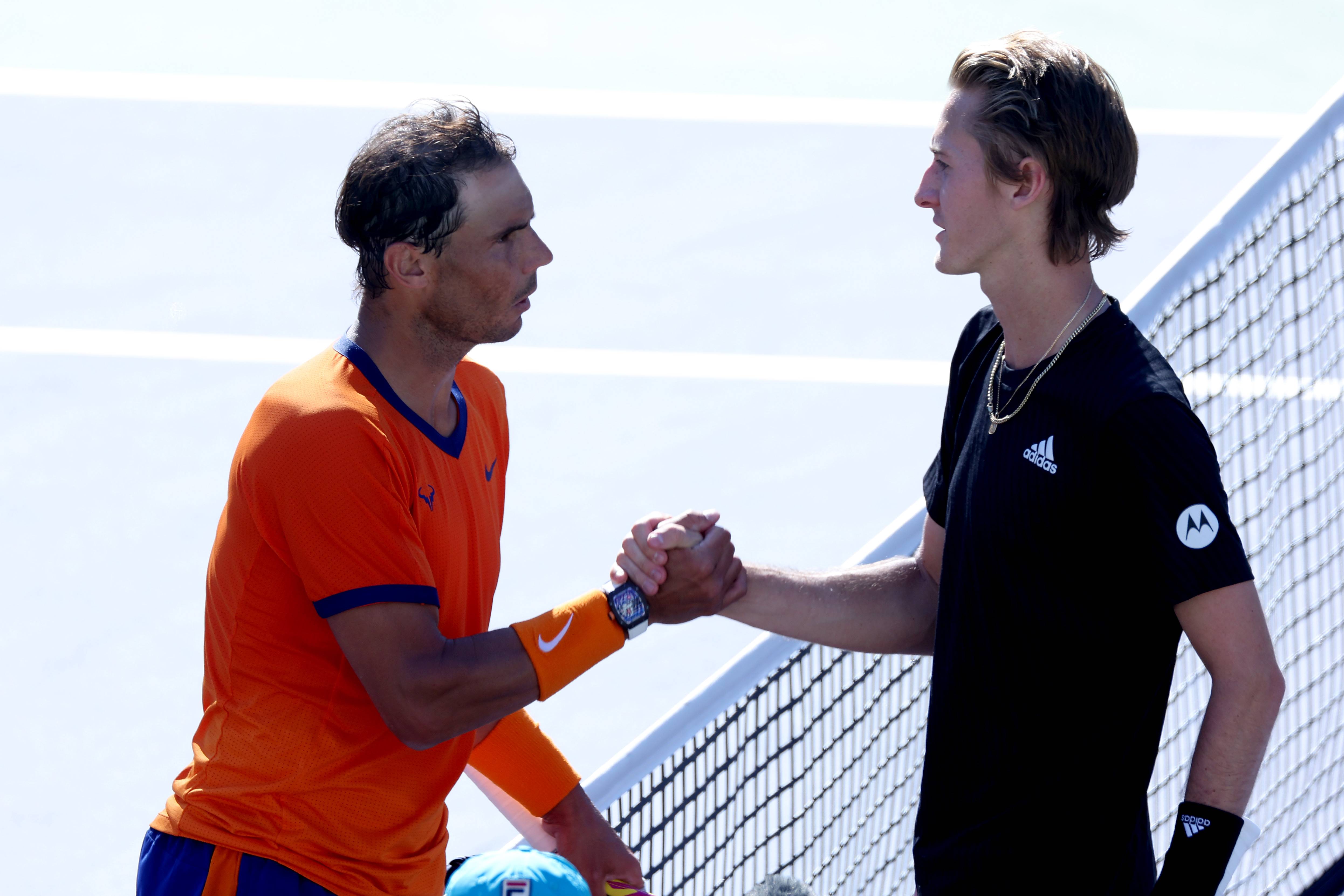 <p>INDIAN WELLS, CALIFORNIA - MARCH 12: Rafael Nadal of Spain shakes hands with Sebastian Korda of the United States after defeating him during the BNP Paribas Open at Indian Wells Tennis Garden on March 12, 2022 in Indian Wells, California. Sean M. Haffey/Getty Images/AFP
