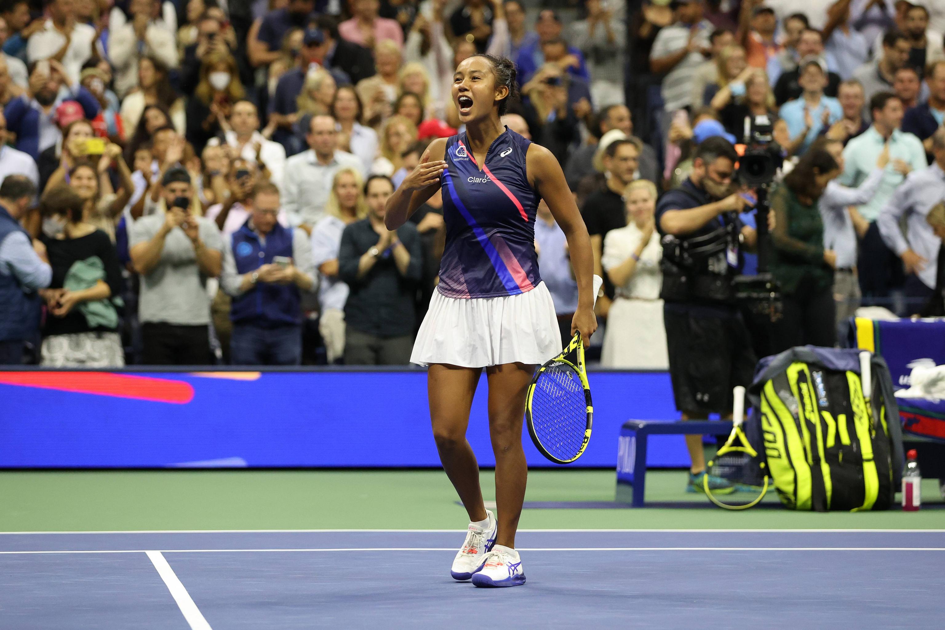 Leylah Annie Fernandez celebrates defeating Aryna Sabalenka during the US Open semi-final game on Sept 9, 2021.