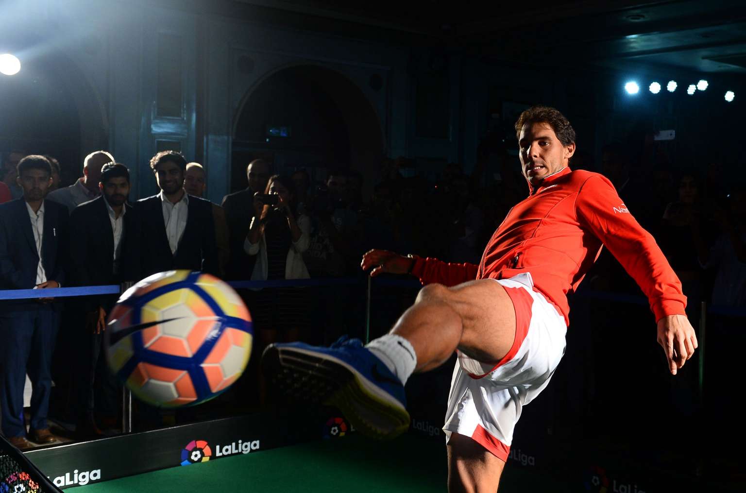Spanish tennis player Rafael Nadal plays with a football at a function to promote the Spanish football league, in New Delhi on Sept 15, 2016.