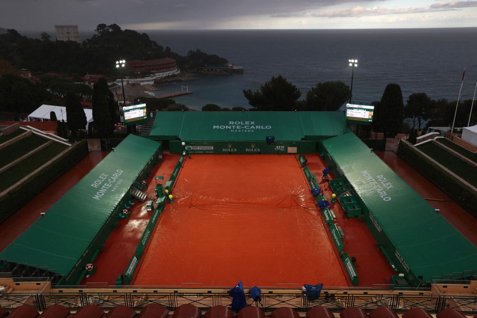 Ground covers protects the court surface as play is suspended due to rain on day two of the Monte-Carlo Masters, in Monaco on April 12, 2021.