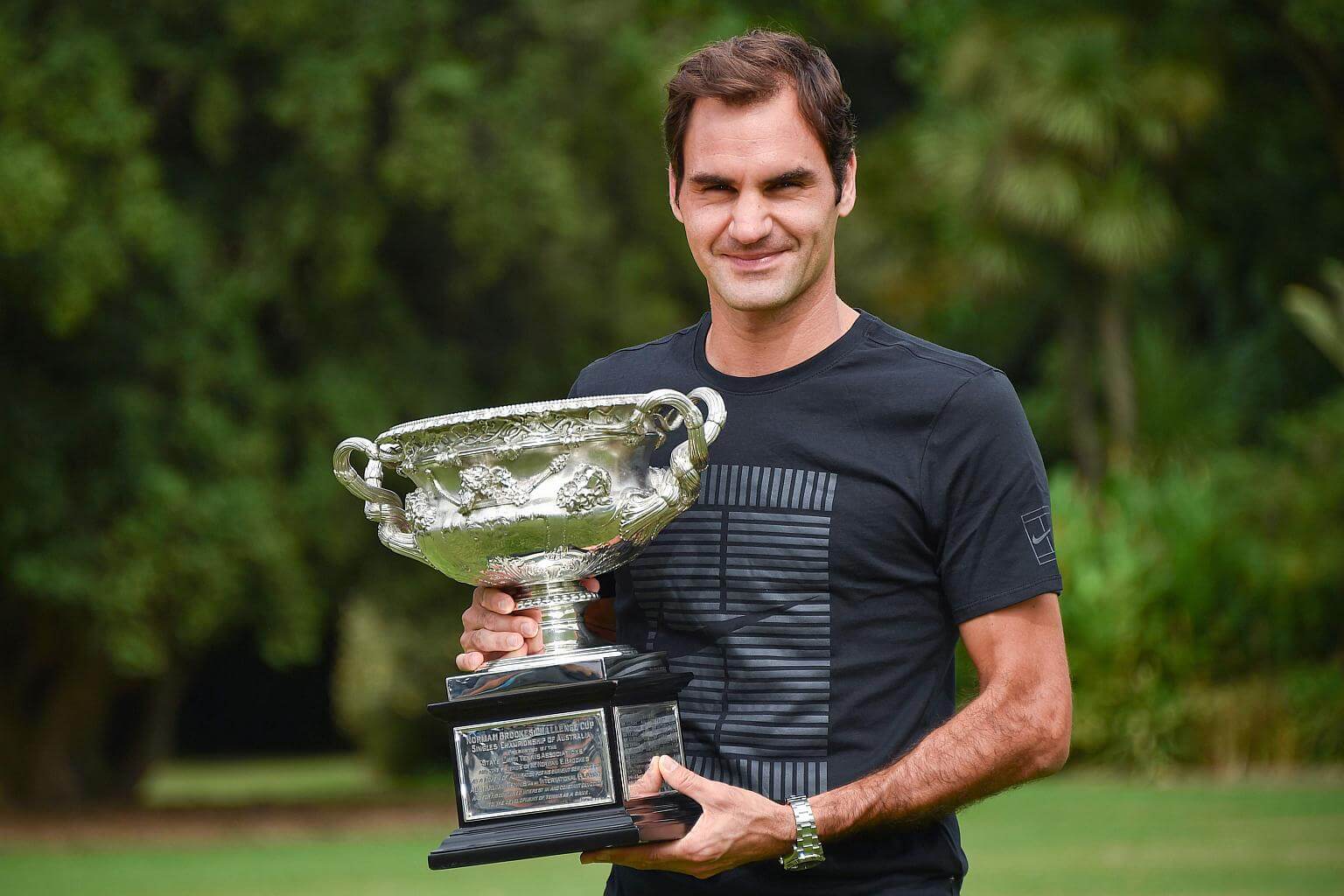 Roger Federer holds the Australia Open trophy at the Government House as he poses for pictures following his win in the Australian Open in Melbourne, on Jan 29, 2018.
