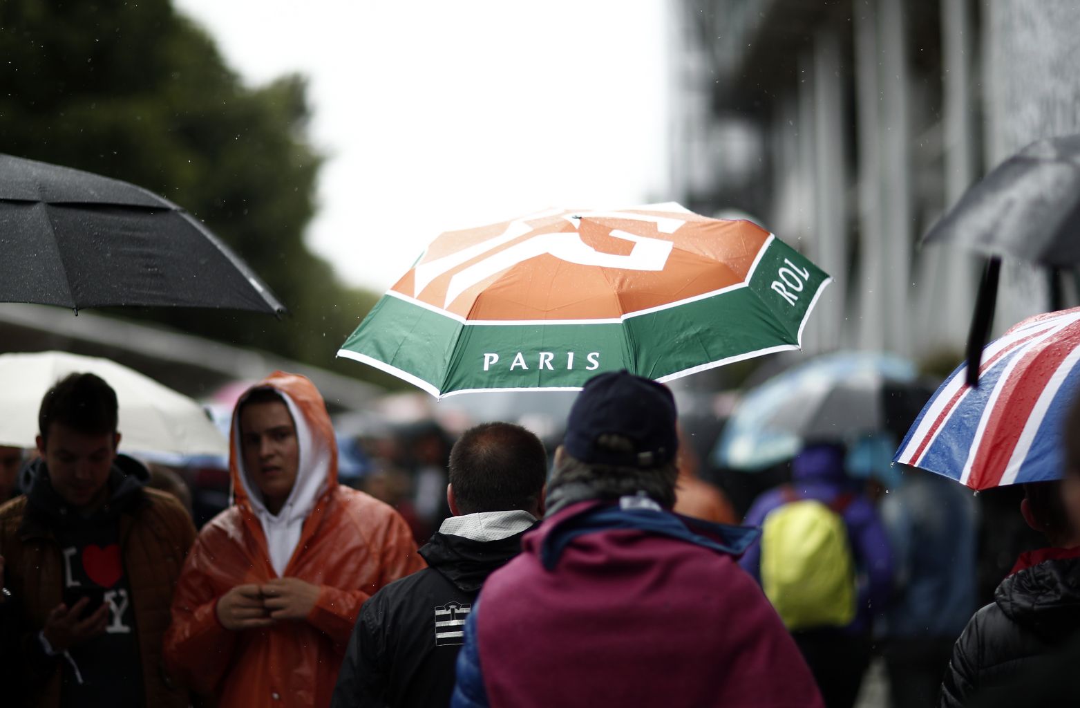 Spectators walk around at Roland Garros, as no matches are played due to rain.