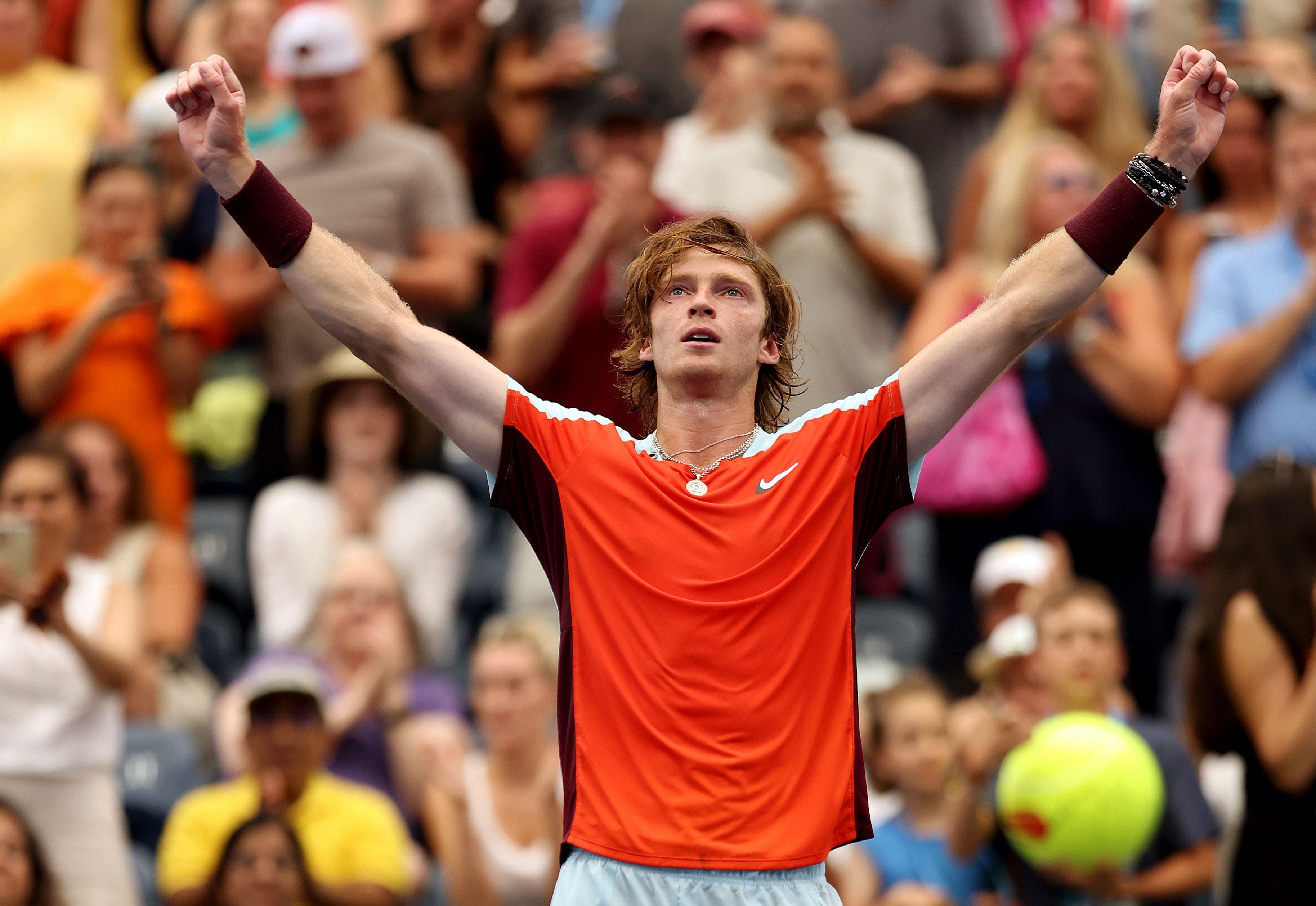 Andrey Rublev celebrates after defeating Cameron Norrie, on Sept 5, 2022.