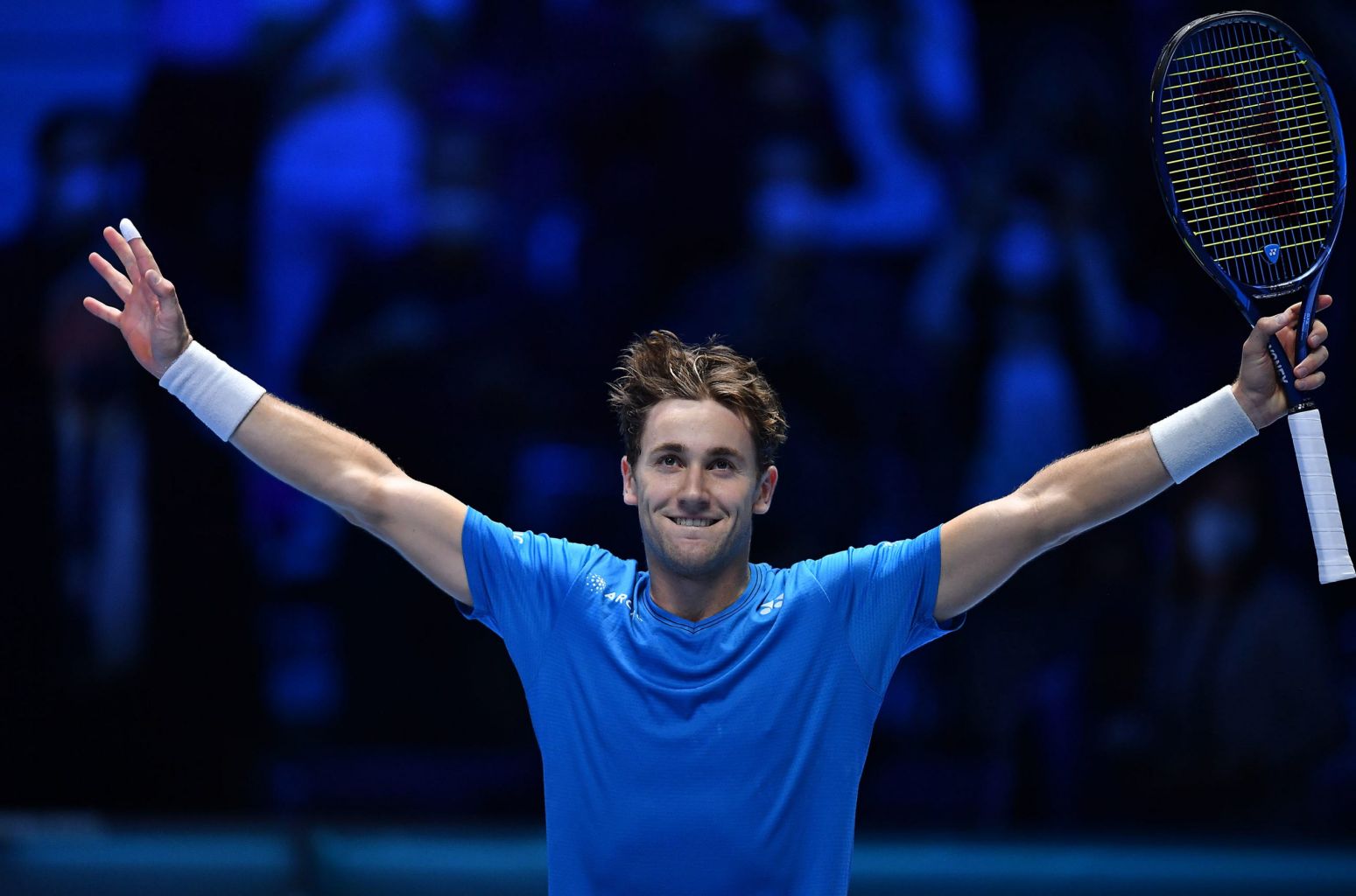 Casper Ruud celebrates after winning his group stage match against Andrey Rublev of Russia.