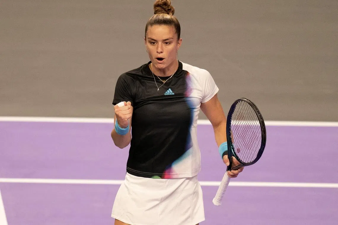 Maria Sakkari reacts to winning the first set during her match on day one of the WTA Finals on Oct 31, 2022.