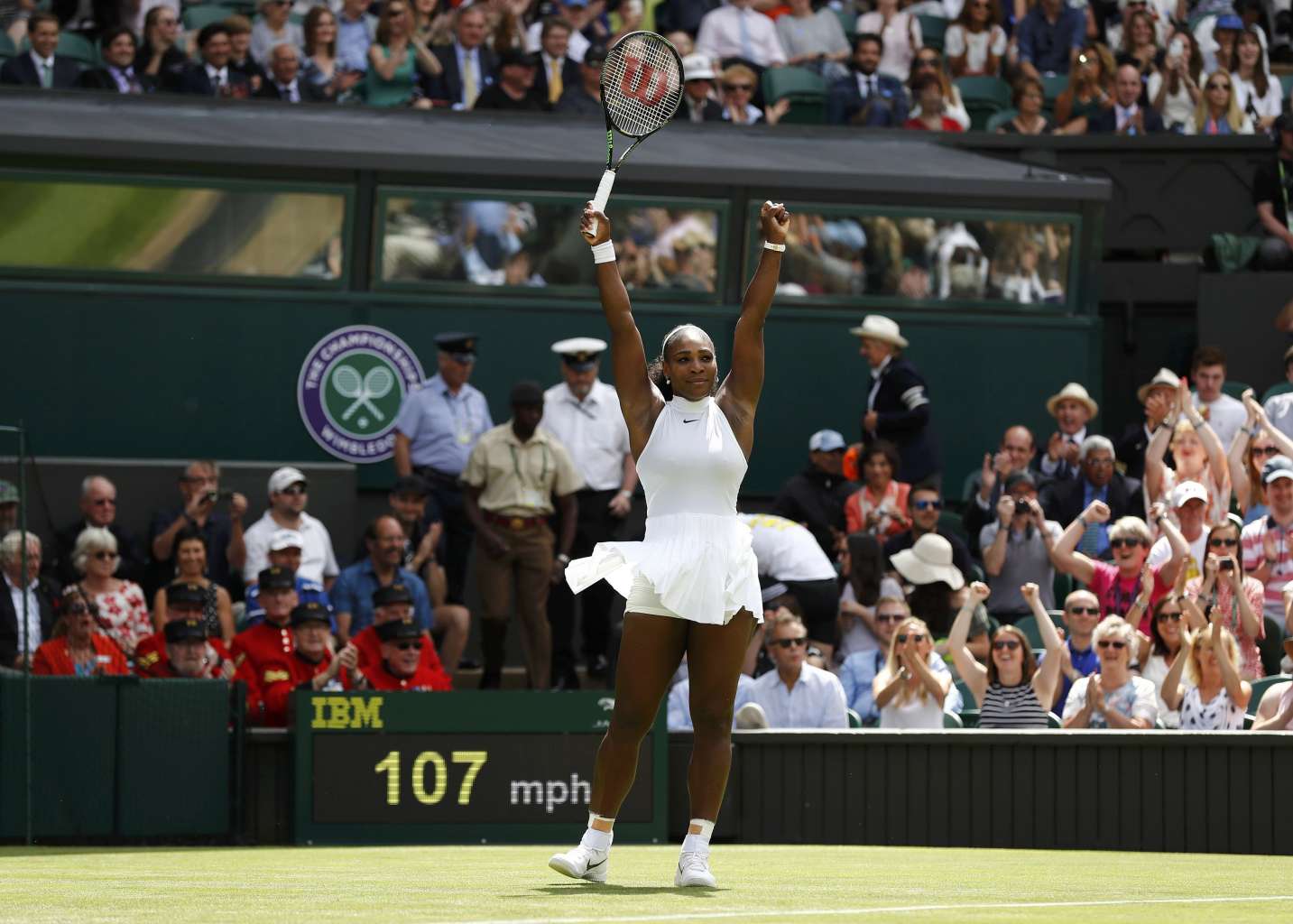 Serena Williams celebrates winning her match against Switzerland's Amra Sadikovic at the 2016 Wimbledon Championships on June 28, 2016.