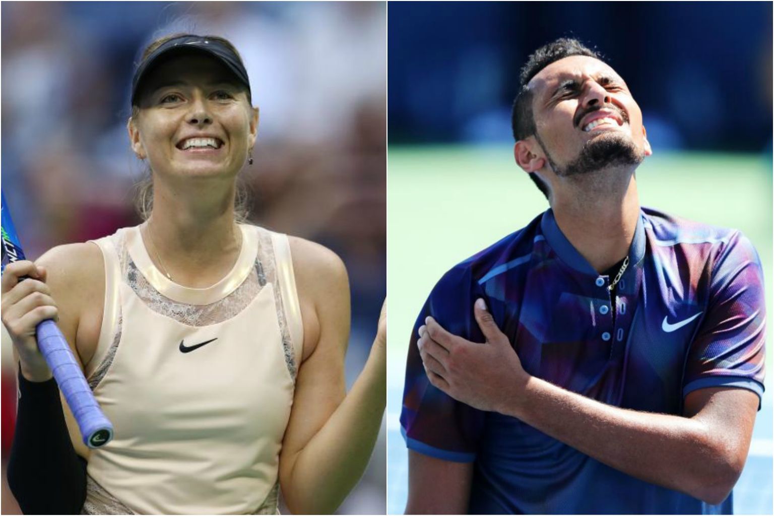 Maria Sharapova (left) reacts after defeating Timea Babos. Nick Kyrgios (right) holds his shoulder while playing against John Millman.