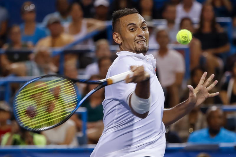 Nick Kyrgios hitting a shot against Stefanos Tsitsipas during their semifinal match at the Citi Open tournament on Aug 3, 2019.