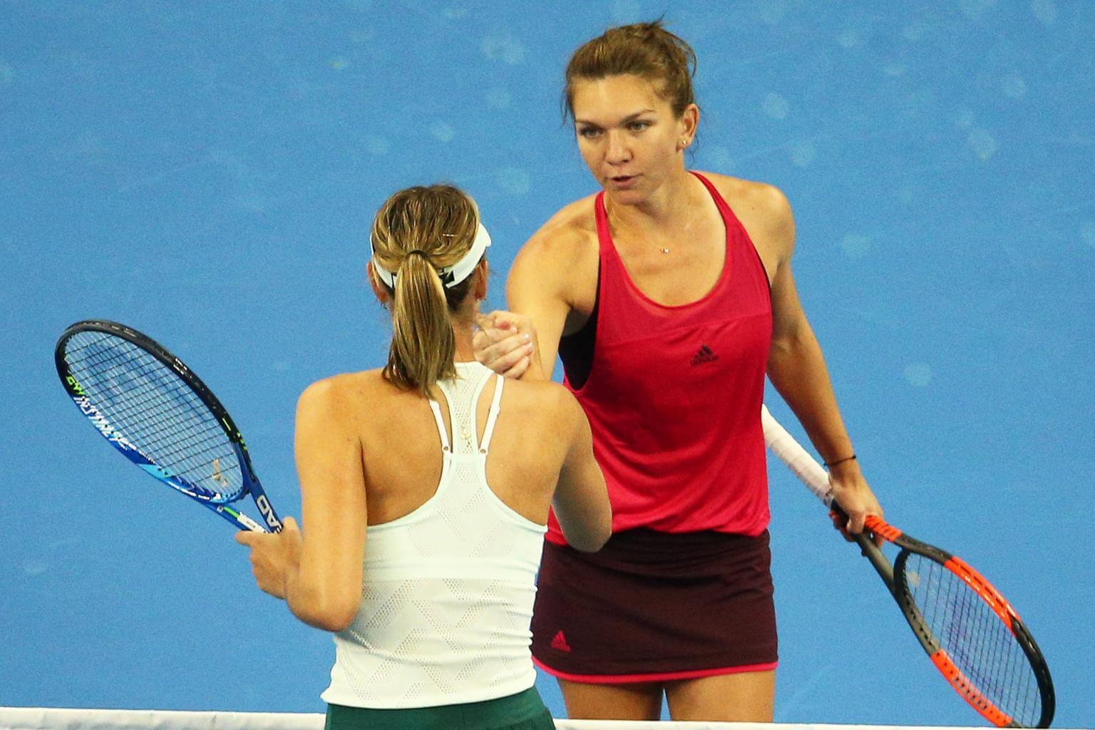 Maria Sharapova (left) congratulates Simona Halep after their women's third round match of the China Open tennis tournament at the National Tennis Center in Beijing, China on Oct 4, 2017.