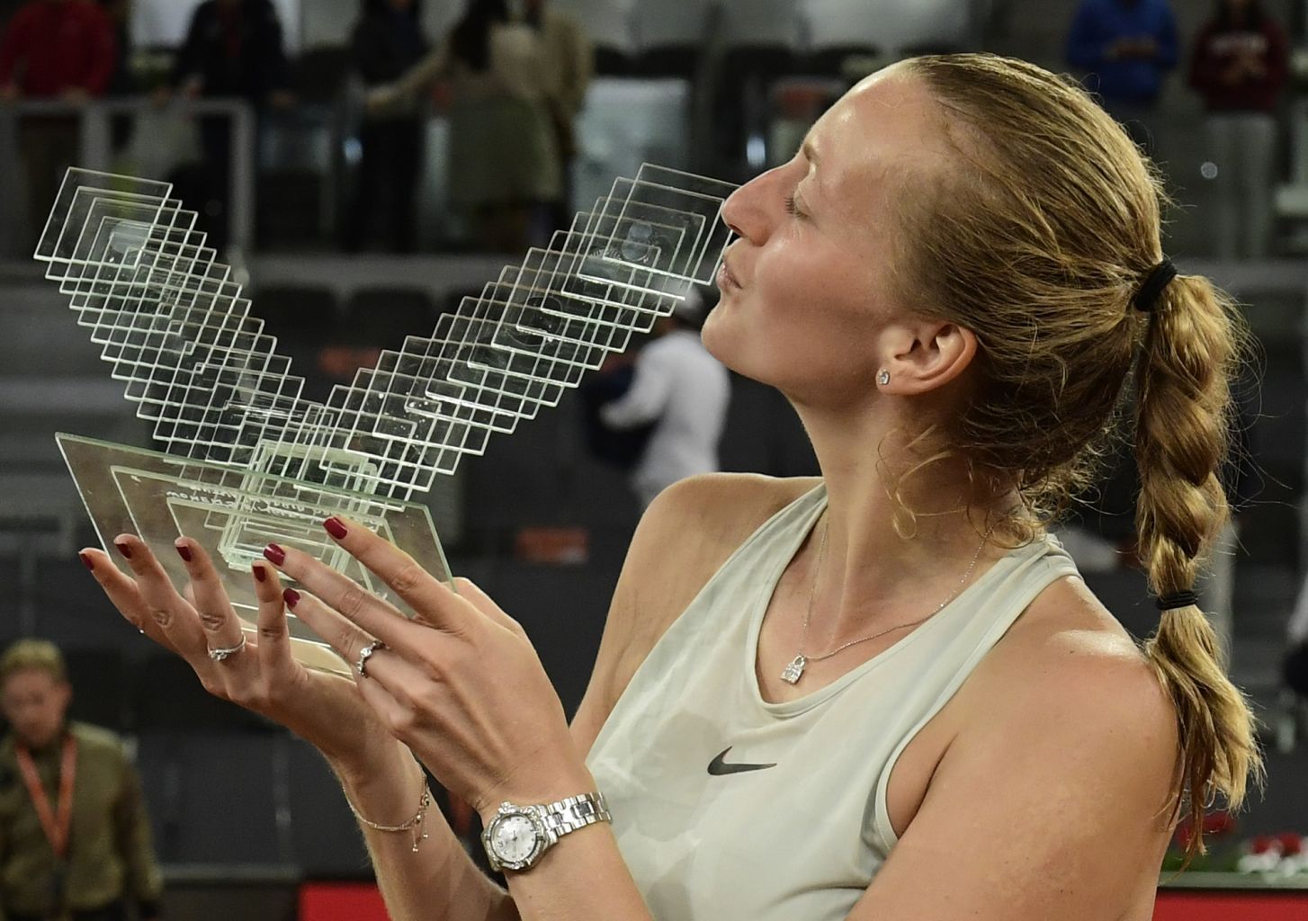 Kvitova kissing her trophy after winning the Madrid Open in May 2018.