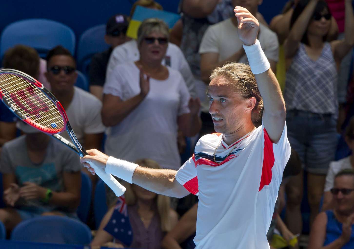 Alexander Dolgopolov of Ukraine celebrates his victory against Lleyton Hewitt of the Australia Gold team during their match on Jan 7, 2016.