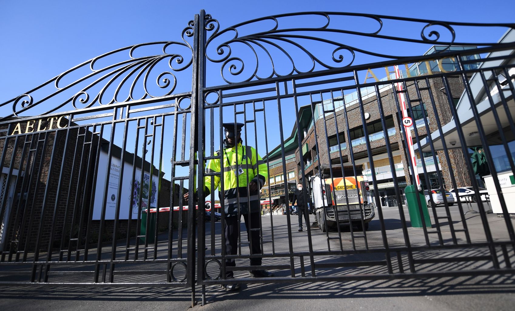 A security guard at the gates of the All England Lawn Tennis Club in Wimbledon, London, April 1, 2020.