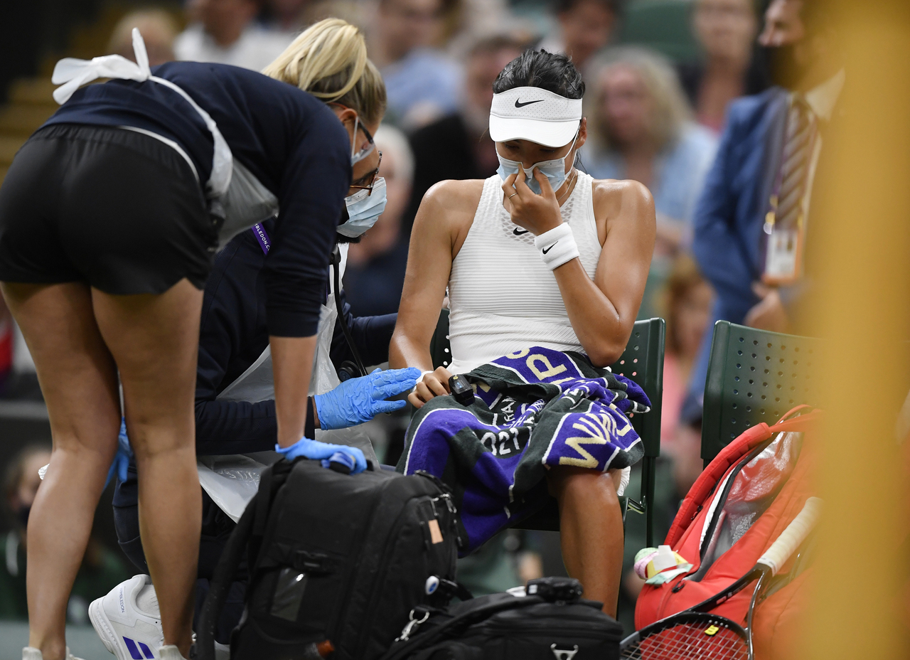 Emma Raducanu receives medical attention during her fourth round match against Australia's Ajla Tomljanovic at Wimbledon on July 5, 2021.