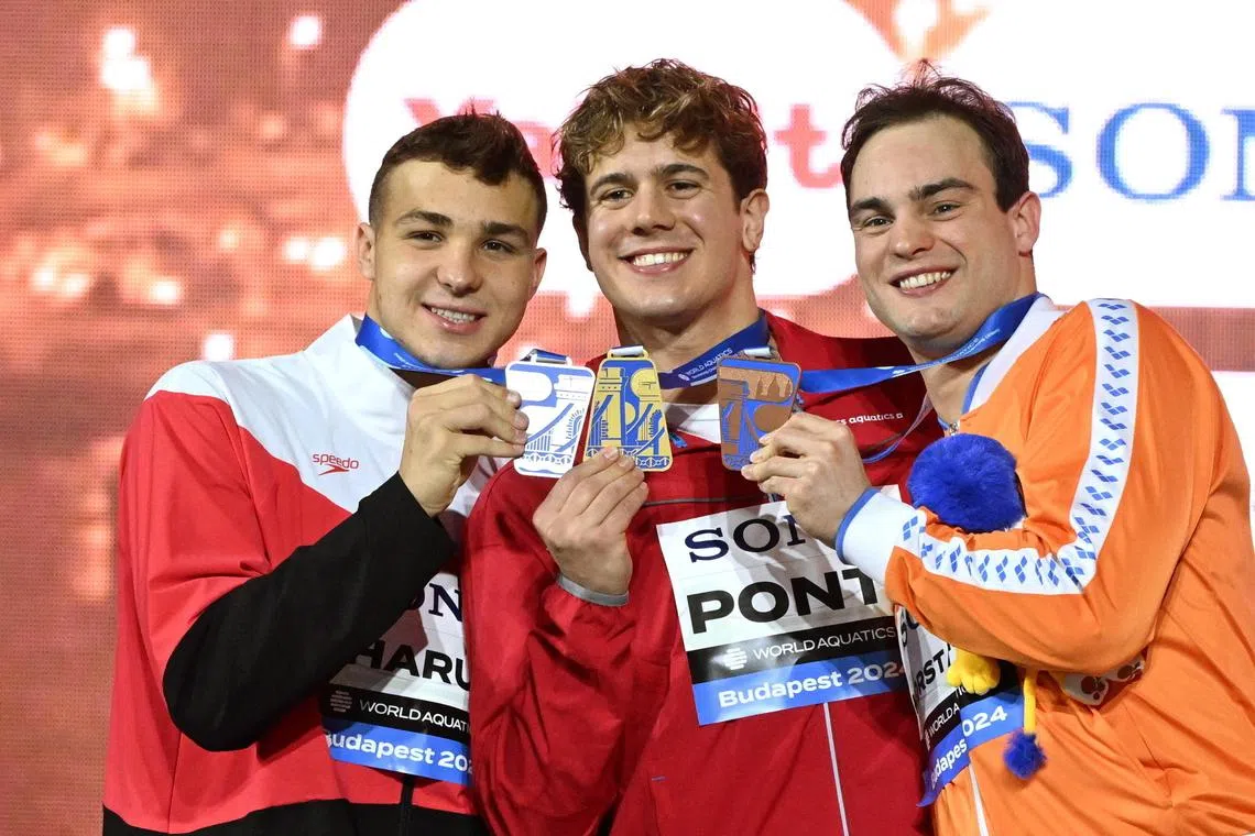 Champion Noe Ponti posing with silver medallist Ilya Kharun (left) and Nyls Korstanje on the podium during the medal ceremony for the 50m butterfly at the World Aquatics Swimming Championships (25m) in Budapest on Dec 11.