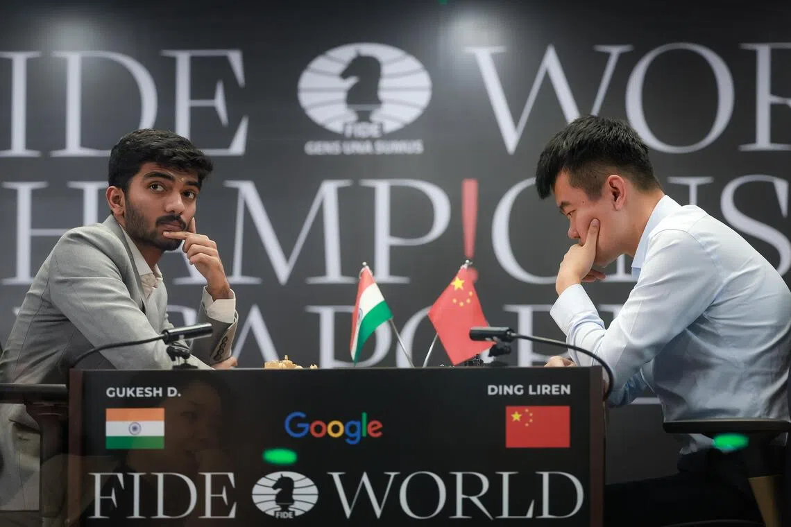 India’s Gukesh Dommaraju (left) and China’s Ding Liren during Game 1 of the Fide World Chess Championship Singapore held at the Resorts World Sentosa on Nov 25, 2024.