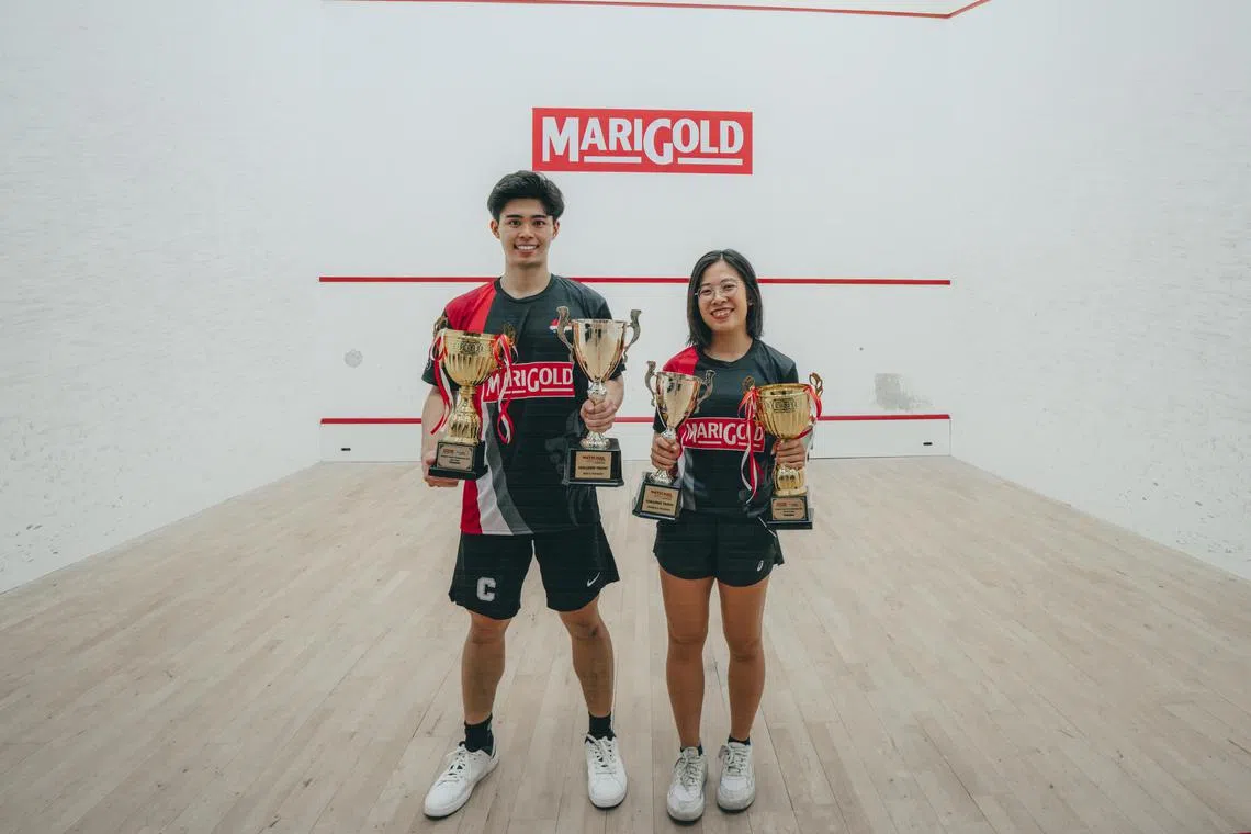 Aaron Liang and Au Yeong Wai Yhann with their trophies after the Singapore Squash Championships.