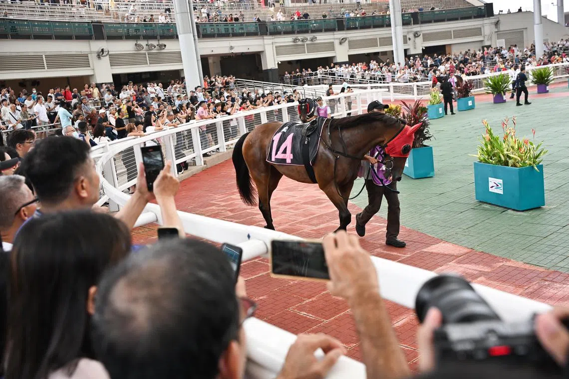 Guests and members of the public viewing the race horses in the parade ring at the Singapore Turf Club on Oct 5.