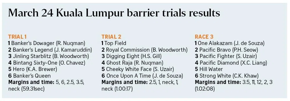 Top Field has yet to open his Malaysian win account but on the evidence of his impressive barrier trial win on March 24, he may well get off the mark in Race 4 on March 29, if he gets a berth.