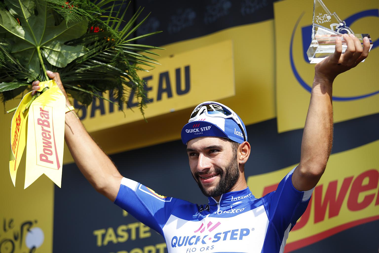 Quick Step Floors rider Fernando Gaviria celebrates on the podium after winning the 4th stage of the 105th edition of the Tour de France, on July 10, 2018.