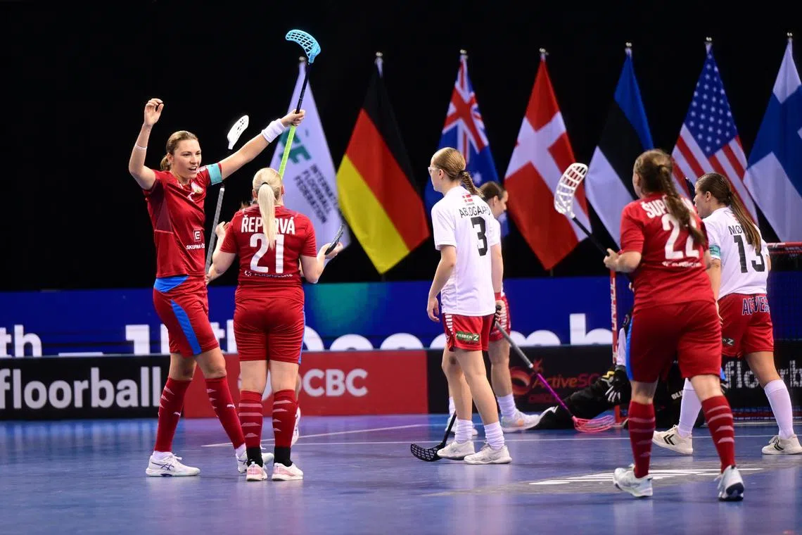 Czech Republic captain Eliska Krupnova (left) celebrating a goal with her teammates during their 13-1 victory over Denmark in the Women's World Floorball Championship quarter-finals on Dec 8.