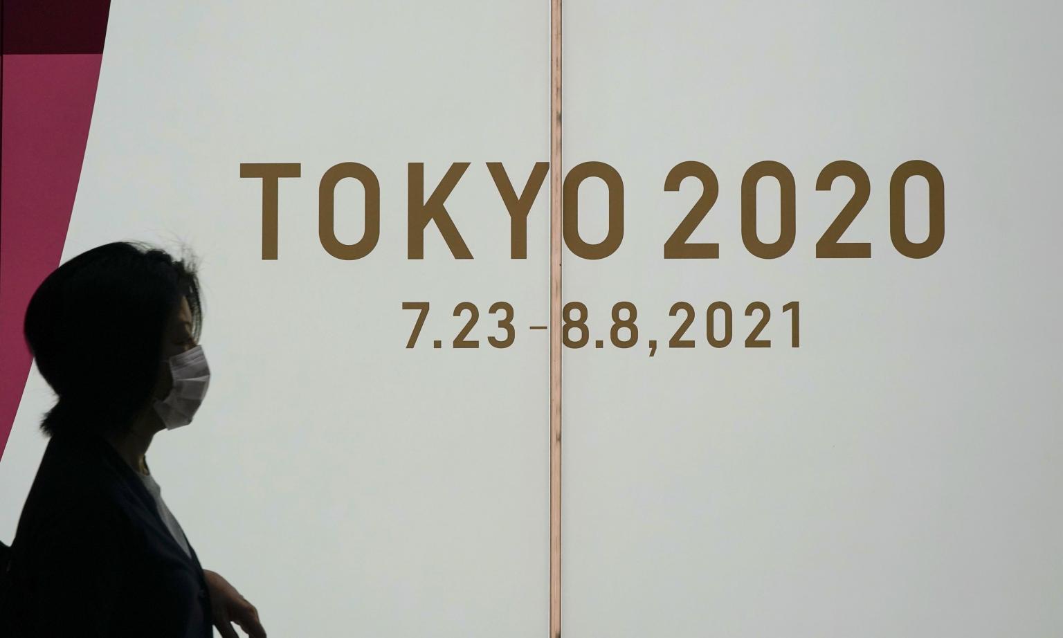 A pedestrian walks past the emblem and the schedule of the Tokyo 2020 Olympic Games with a re-scheduled date in Tokyo on Oct 7, 2020.