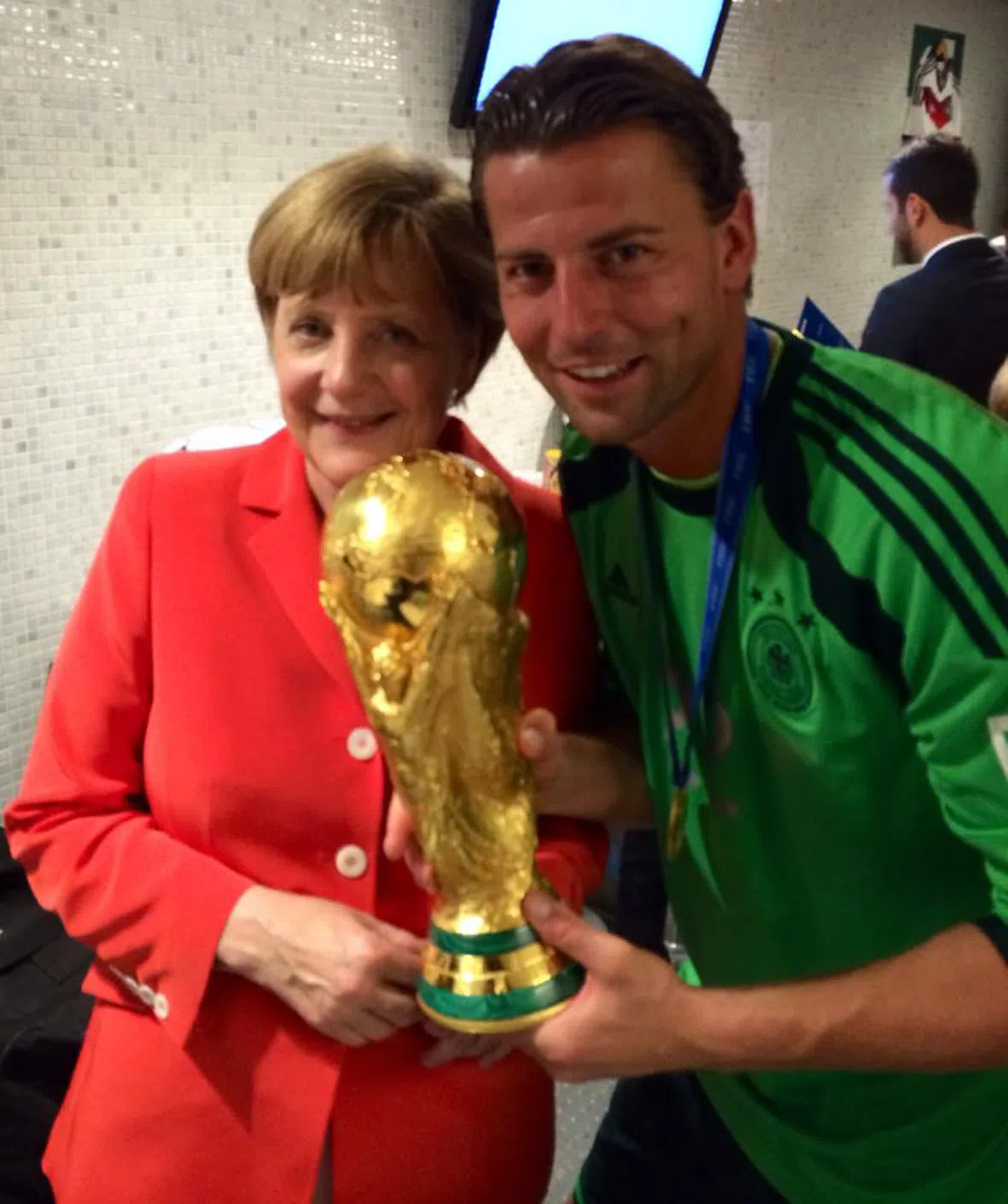 In fact, winning nations have to return the prize to Fifa for safekeeping after post-final celebrations, and receive a replica to keep instead. Weidenfeller and former German chancellor Angela Merkel – whom he is proudly pictured with along with the trophy – are among a privileged few.