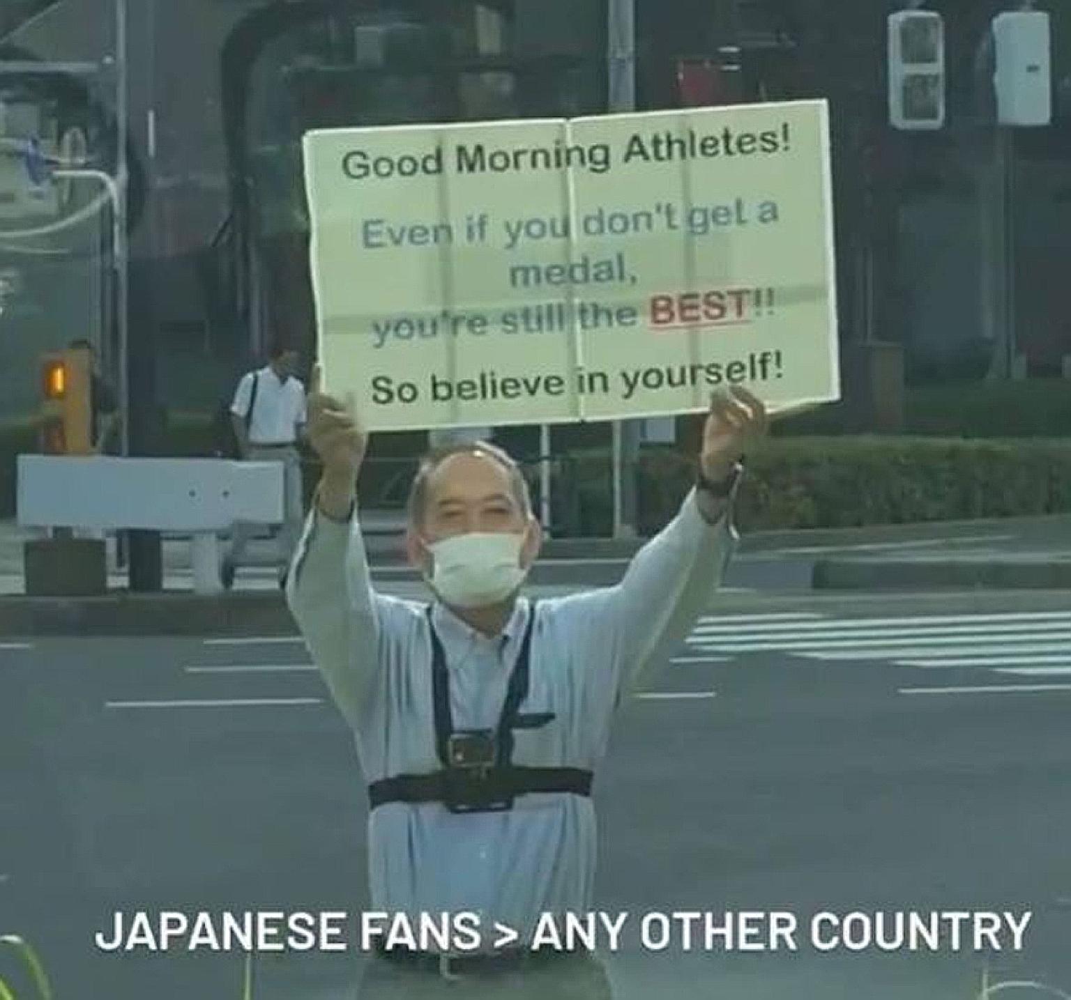 This photo of a fan holding up a sign with words of encouragement for Tokyo 2020 athletes at the athletes' village has gone viral on social media.