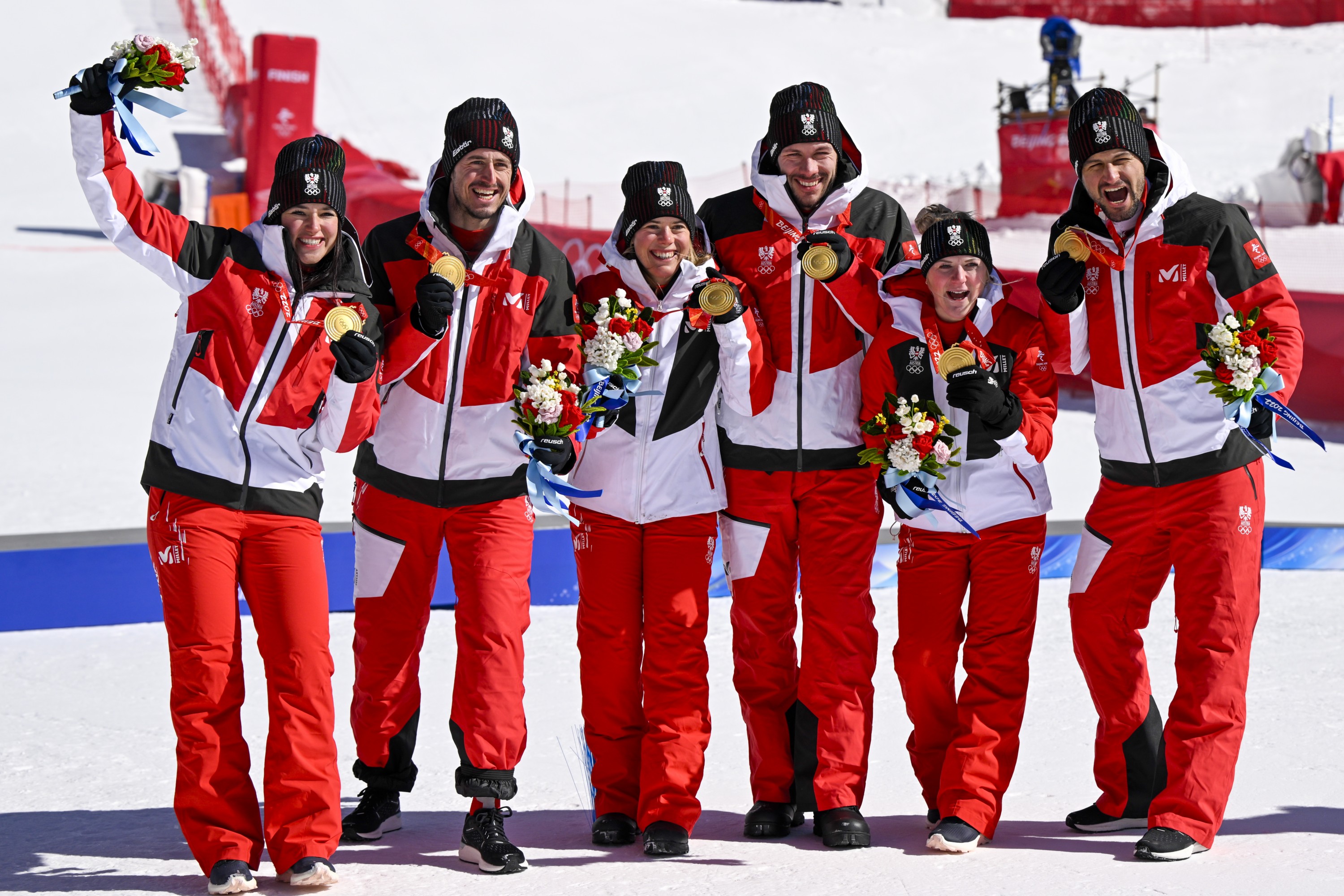 Austria celebrating after winning the gold at the Alpine Skiing Team event in Beijing on Feb 20, 2022.