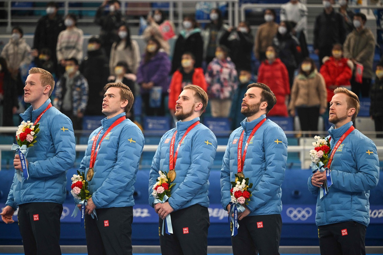 Sweden's men's curling team sing their national anthem on the podium after clinching the gold medal, on Feb 19, 2022.