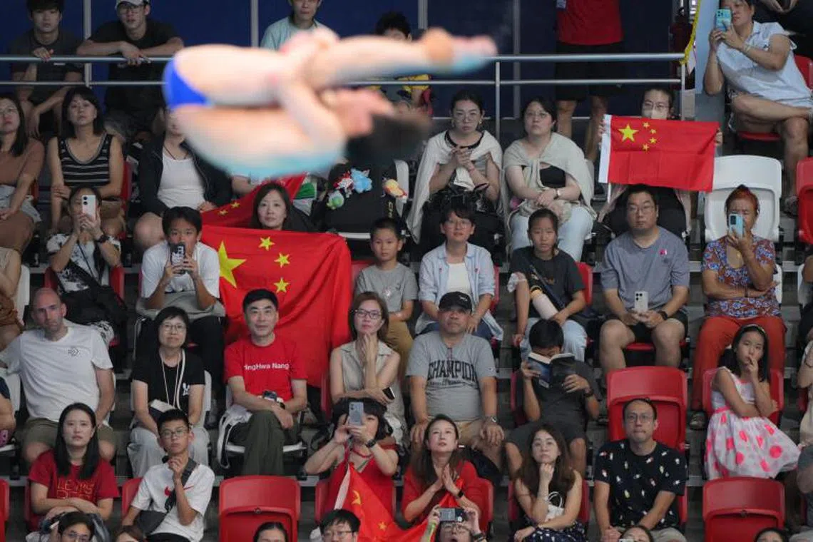 The crowd, including fans holding up the flag of China, seen as Chinese diver Zhu Zifeng dives his second last jump at the World Aquatic Championship.