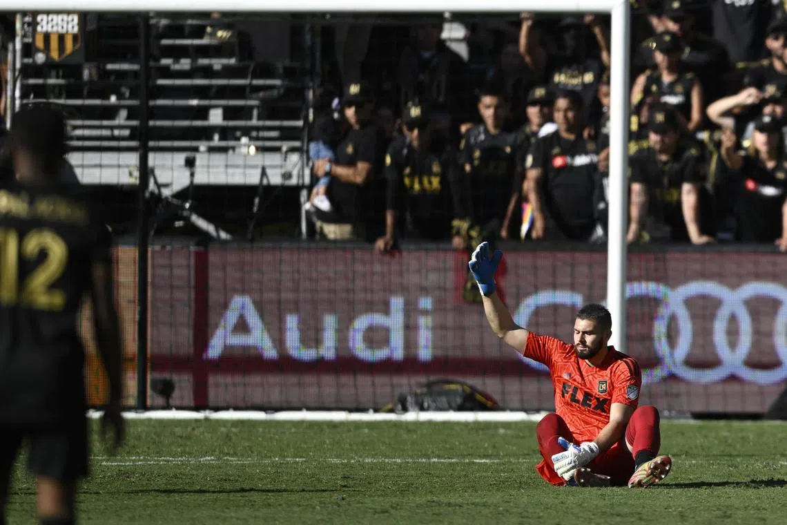 Nov 5, 2022; Los Angeles, California, US; Los Angeles FC goalkeeper Maxime Crepeau (16) reacts after a collision during overtime against Philadelphia Union at Banc of California Stadium. Mandatory Credit: Kelvin Kuo-USA TODAY Sports