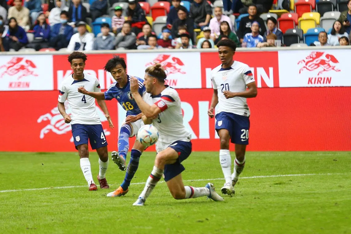 Kaoru Mitoma (in blue) scoring the second goal in Japan’s 2-0 win over the United States in September.