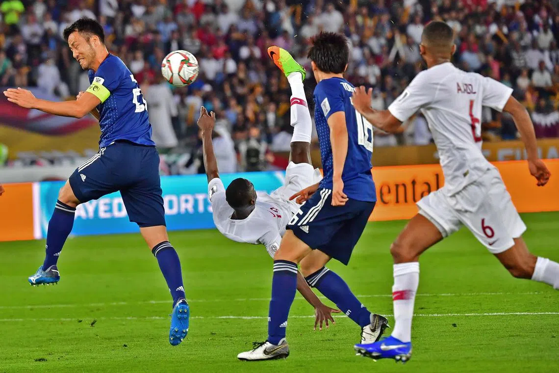 Almoez Ali (second from left, in white) set Qatar off on their way to victory over Japan in the 2019 Asian Cup final with an acrobatic goal.