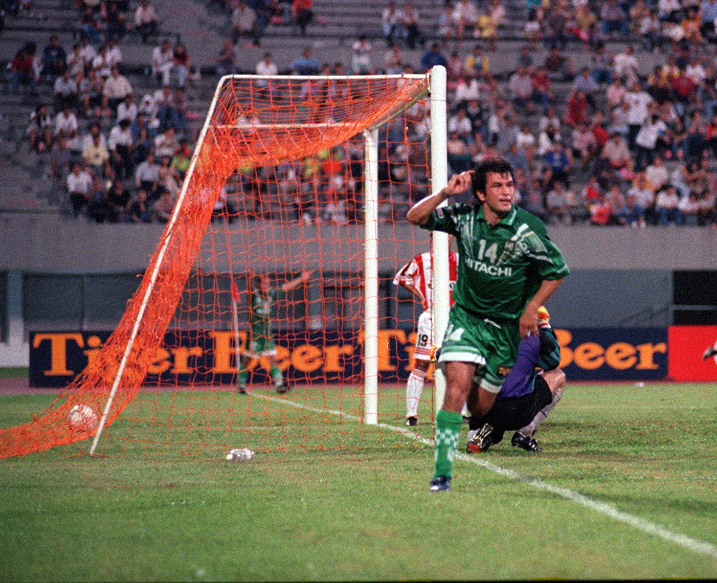 Hamid Reza Estili, seen here scoring for Geylang against Tiong Bahru in 1996, would go on to score on football’s biggest stage two years later.