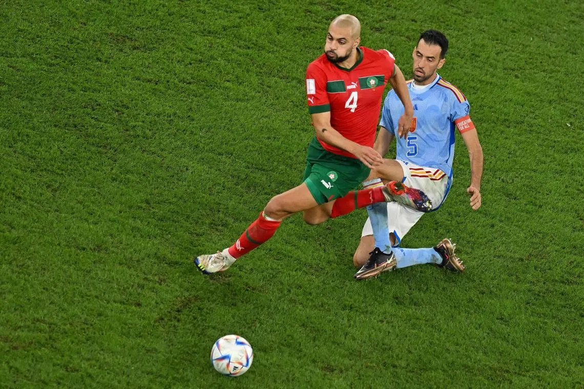 Sofyan Amrabat (front), here winning the ball off Spain’s Sergio Busquets, has been described as “world class.”