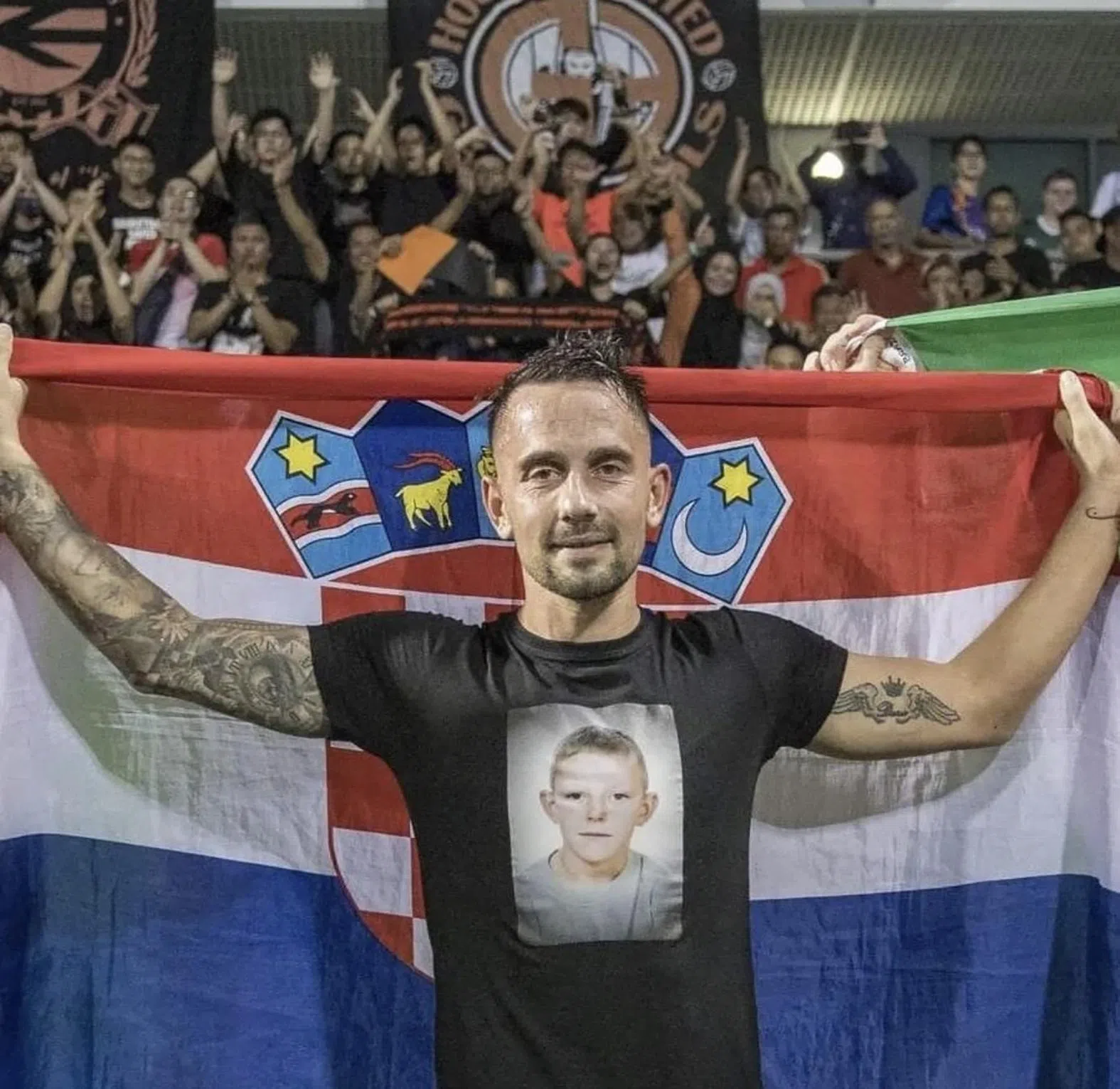 Kristijan Krajcek holding the Croatian flag after Hougang’s Singapore Cup triumph on Nov 19.