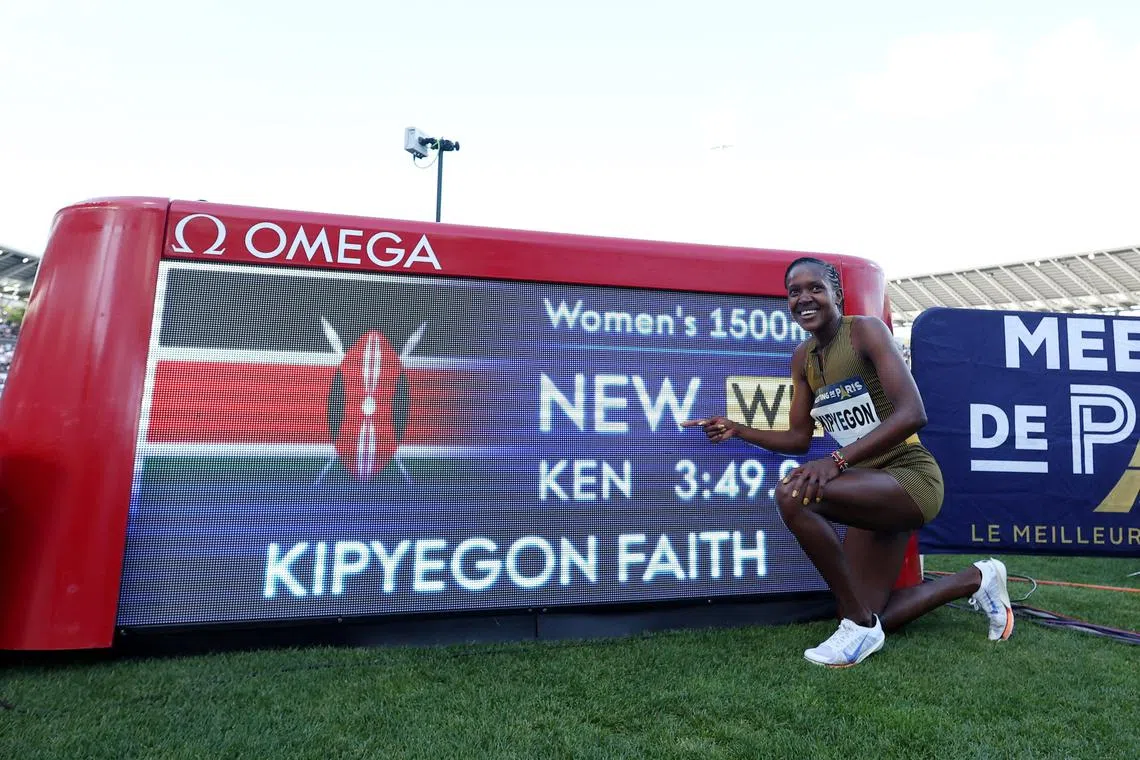 In the 1,500m, led out by two pacemakers, two-time defending Olympic champion Kipyegon broke to the front and clocked 3min 49.04sec in a superb display of running. It improved by 0.07sec her previous best set in Florence, Italy, in June 2023.