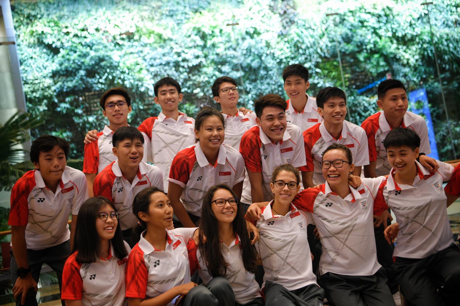 Singaporean athletes pose for a group picture during a send off for the Youth Olympic Games at Changi Airport Terminal 3, on Oct 2, 2018.