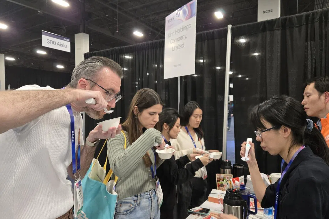 Members of the media trying out Kirin’s Electric Salt Spoon, which amplifies flavours such as saltiness and umami in foods using electrical currents.