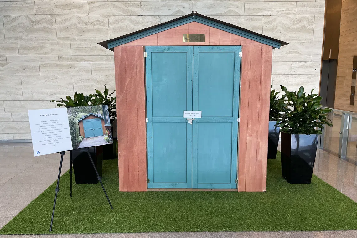 A replica of the HP Garage where founders Bill Hewlett and David Packard started the company in 1939 and worked on its first products.