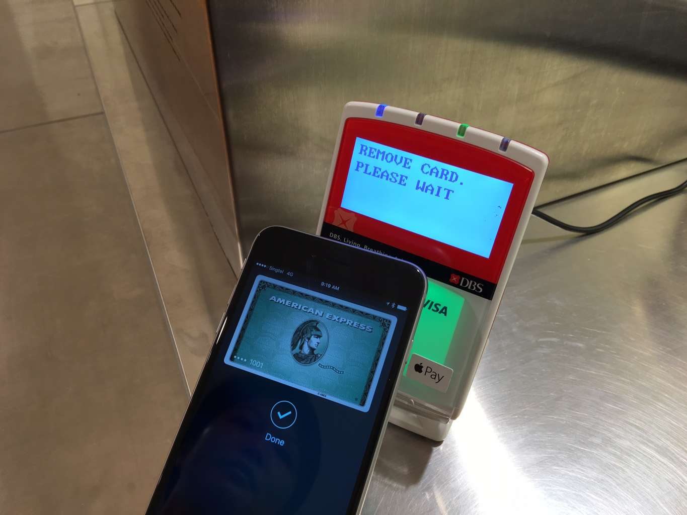 An American Express (Amex) card user in Singapore making a payment using an iPhone.