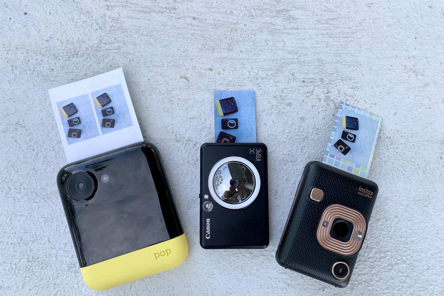 (From left:) Instant camera printers Polaroid Pop, Canon iNSPiC and Fujifilm instax mini LiPlay.