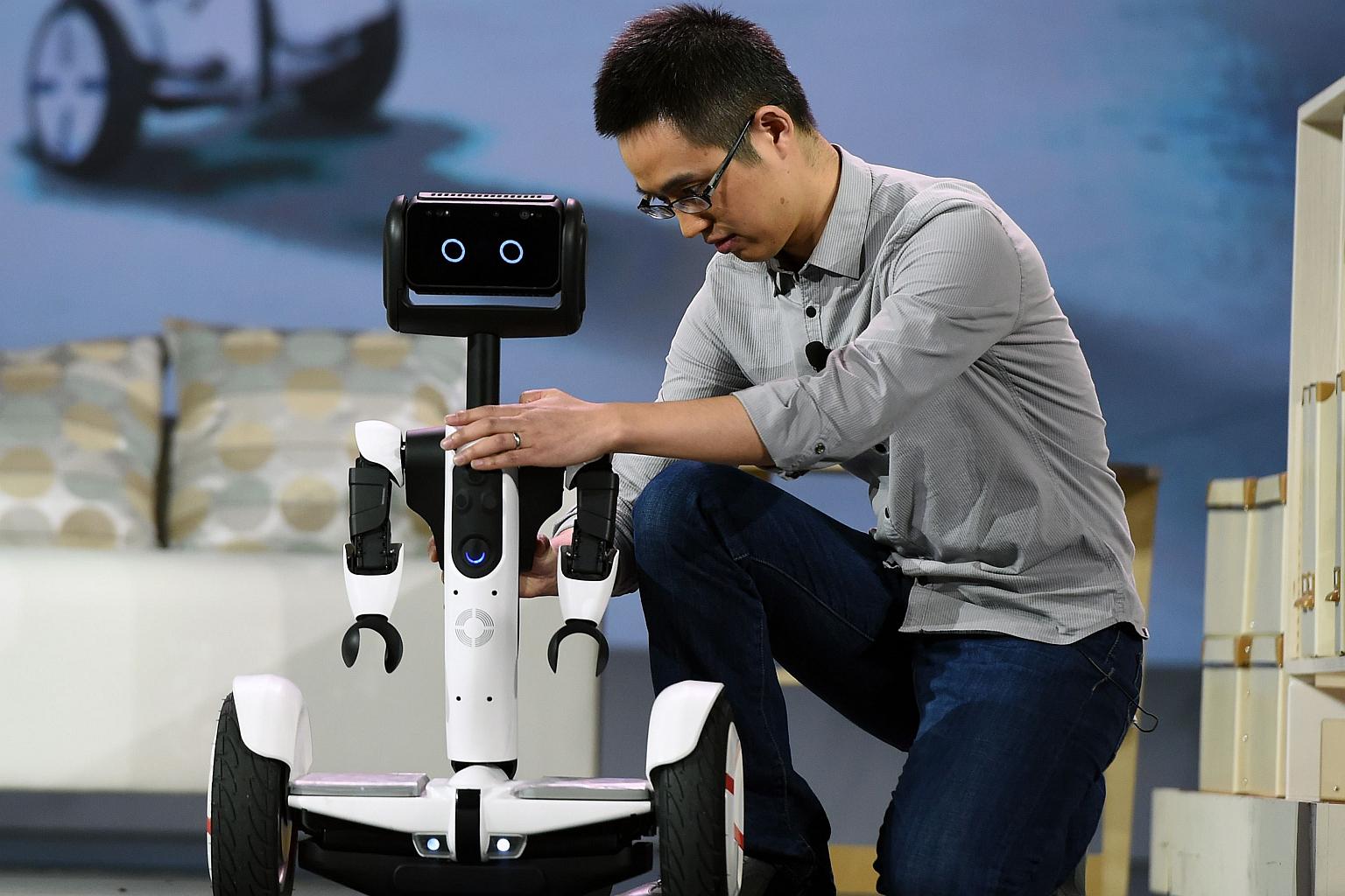 Arms are affixed to a self-balancing Ninebot Segway personal transportation robot during a keynote address by Intel Corp.
