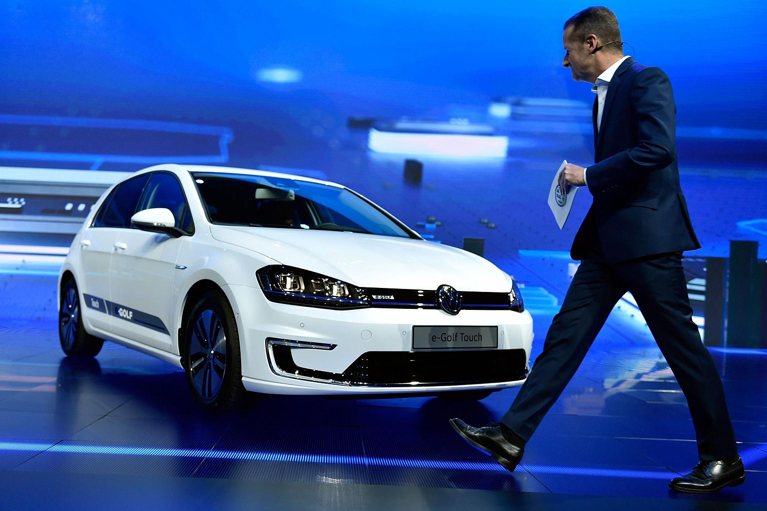 Volkswagen Passenger Cars CEO Dr Herbert Diess walking by Volkswagen's new e-Golf Touch vehicle during a press event.