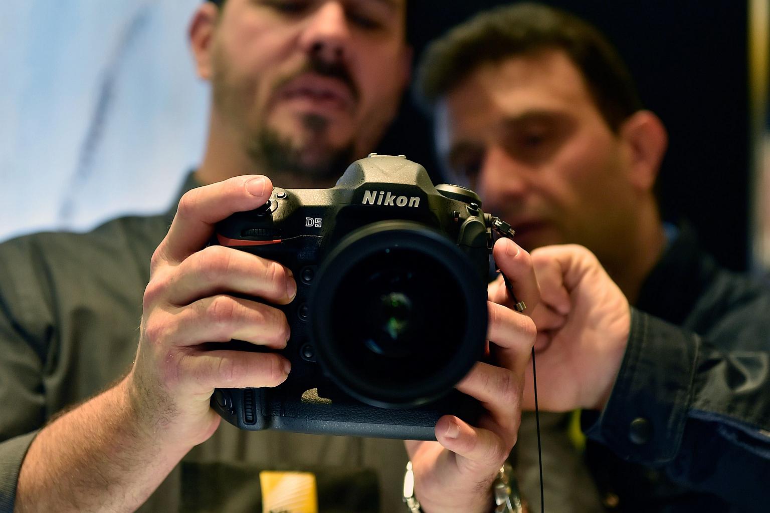 An attendee using the Nikon D5 DSLR camera at the Nikon booth at CES 2016.