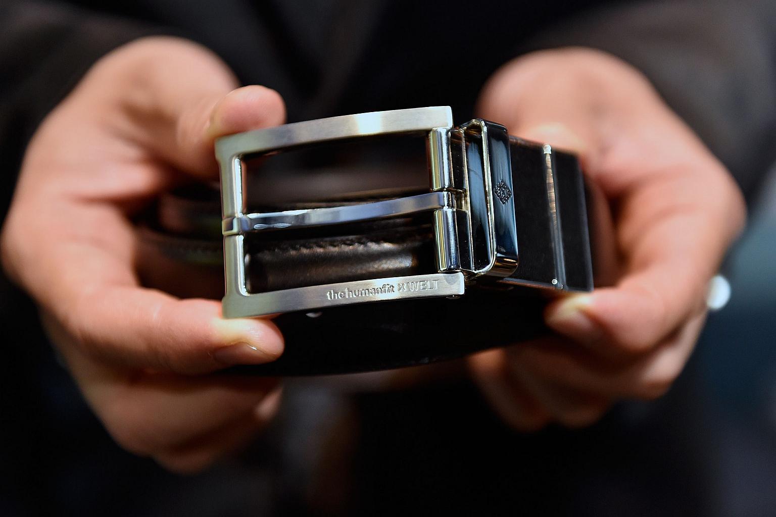 Samsung's Welt, the smart belt that monitors the user's waistline with an app, is displayed at the Samsung booth at CES 2016.