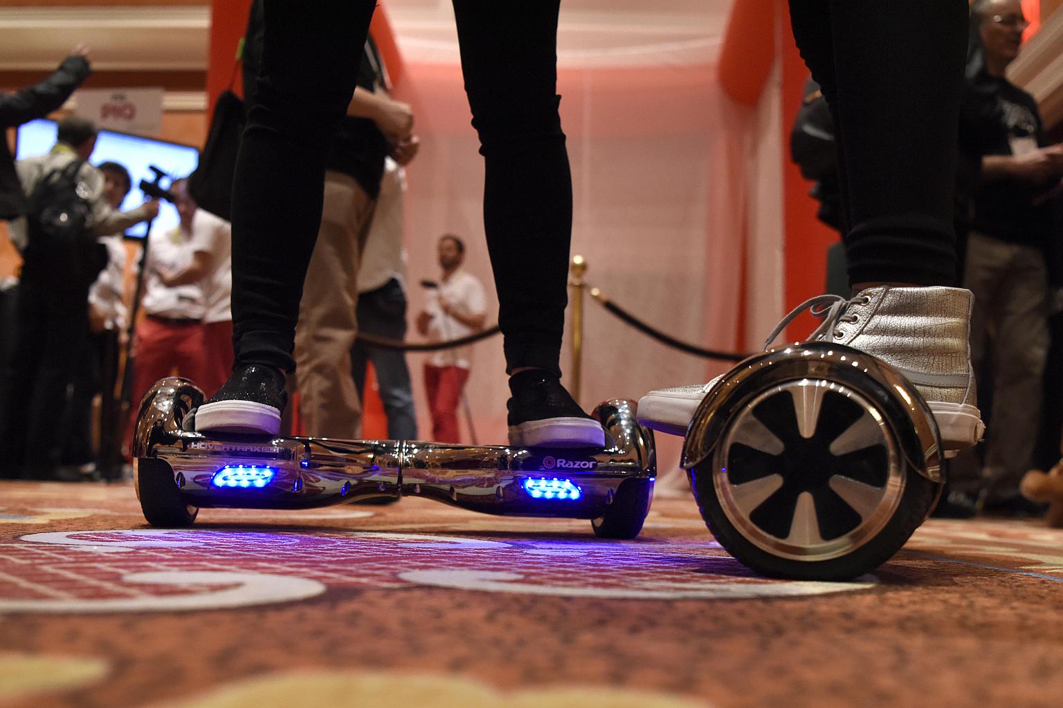 Exhibitors riding Razor Hovertrax Hover Boards during ShowStoppers at CES 2016.